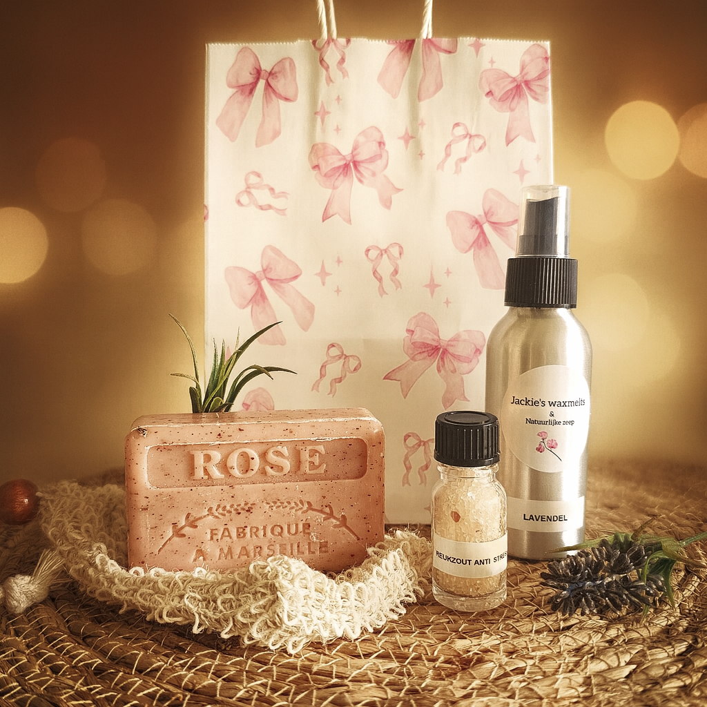 Deze liefdevolle set bevat een kalmerende roomspray Lavendel voor een rustgevende sfeer, anti-stress reukzout om even diep- adem te halen en te ontspannen en een natuurlijke Franse rozenscrubzeep die je huid voedt en laat stralen.