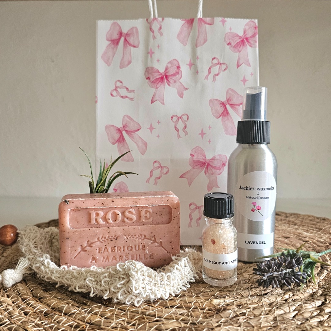 Deze liefdevolle set bevat een kalmerende roomspray Lavendel voor een rustgevende sfeer, anti-stress reukzout om even diep- adem te halen en te ontspannen en een natuurlijke Franse rozenscrubzeep die je huid voedt en laat stralen.